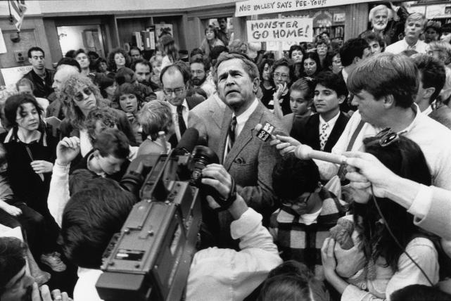 He Came to Noe Valley. In his first scheduled trip to San Francisco since grabbing office in 2000, President George W. Bush chose the Noe Valley Library for his only public appearance. This photograph was taken moments before the motley crowd, perhaps riled up by a scene from a Mel Gibson film, stoned him.