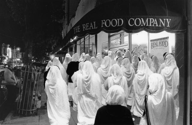 Since last September, a bevy of protesters has held a 24-hour kneel-in vigil on 24th Street in the hopes that their prayers can bring back the organic fruits and vegetables we all now crave. Camped out in front of the empty storefront that formerly housed the Real Food Company (a subsidiary of Nutrafutile Corp.), the postulants have taken only brief bathroom and lunch breaks, despite foul weather, aggressive panhandlers, and police citations for blocking the street. The vigil appears to be succeeding, however. From this recent photo, it can clearly be seen that the store's overhead lights and trelliswork on the east wall have been restored by prayer. Could the peaches be next?