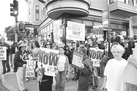 Noe Valleyans gathered at Castro and 24th streets on Oct. 27 to march as a contingent against the war in Iraq. Photo by Beverly TharpSteve Hyman of Sanchez Street, one of the organizers, said his main frustration was "we have now succeeded in totally destabilizing the region and created terrorists. Quite simply, our leaders are addicted to war."