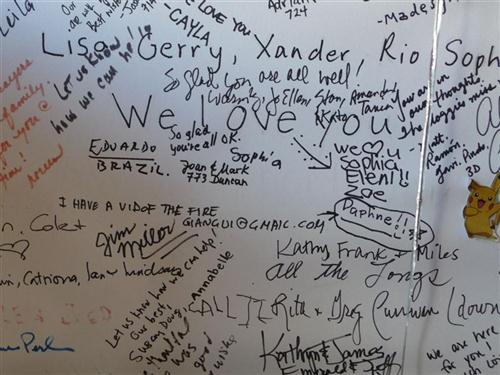 Friends like e-mailer Debi Skaggs rushed to the house, offering warm clothing to Xander's friends and helping them get in touch with their parents. They got the car out of the garage and helped Xander remove anything that could be salvaged. Among the treasures taken to Murad's garage for safekeeping were the children's memory boxes, artwork, photos, and journals, and the Buddha statue that had guarded the front door. Another friend, Kathy Bruin, taped posterboard to the garage door so people could leave messages of encouragement; many did.
