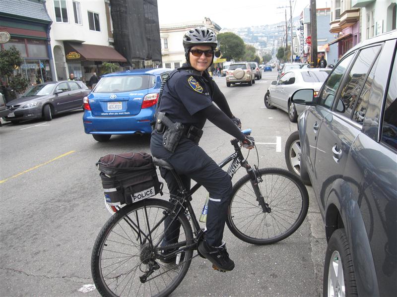 On a Thursday around noon, San Francisco Police Officer Lorraine Lombardo handcuffs her mountain bike outside Bernie's on 24th Street before heading inside the café for a cup of coffee. She's been off duty for a few days, and it's time to catch up with the local merchants and neighbors."People see the handcuffs and they know I'm here," she says. "They come in and tell me what's been going on."