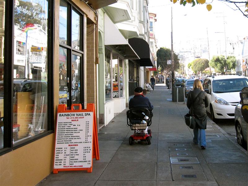 Wheelchair shoppers are not an uncommon sight along 24th Street. But they often have difficulty patronizing some businesses because of entrance barriers, narrow aisles, or inaccessible bathrooms. Photo by Pamela Gerard
