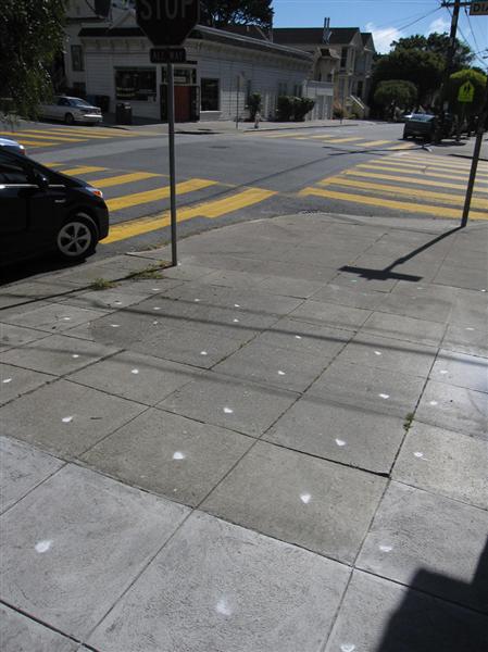 The dots are the work of the Department of Public Works, which is sweeping through city neighborhoods as part of a 25-year cycle to ensure safe sidewalks, said Gloria Chan, a spokeswoman for the agency. The effort began in 2007, and this April was Noe Valley’s turn.