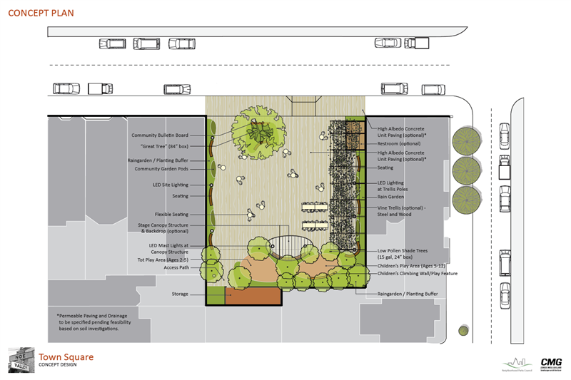 Central Park.  The Recreation and Park Commission has recommended the city buy the parking lot at 24th and Vicksburg streets for use as a town square featuring trees, benches, children’s play areas, and space for the Noe Valley Farmers Market.  Rendering courtesy CMG Landscape Architecture (Click image for full-resolution PDF file.)